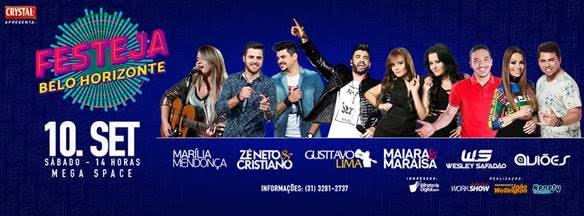 Os principais nomes da música brasileira atual estarão reunidos no Festeja Belo Horizonte. Neste sábado, dia 10 de setembro, a partir das 14h, o Mega Space (Av. das Indústrias, 3000, Santa Luzia,MG) receberá milhares de pessoas que irão curtir os shows de Wesley Safadão, Gusttavo Lima, Aviões do Forró, Zé Neto & Cristiano, Maiara & Maraísa, Marília Mendonça e ainda uma atração surpresa, que é considerado um dos maiores DJs do país. Além disso, os camarotes contarão com shows exclusivos da dupla Henrique & Matheus e do cantor Bernardo Souza, a partir das 1h da madrugada, logo após os shows no palco principal.
